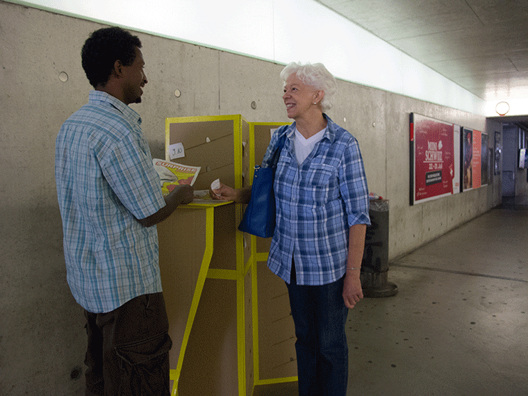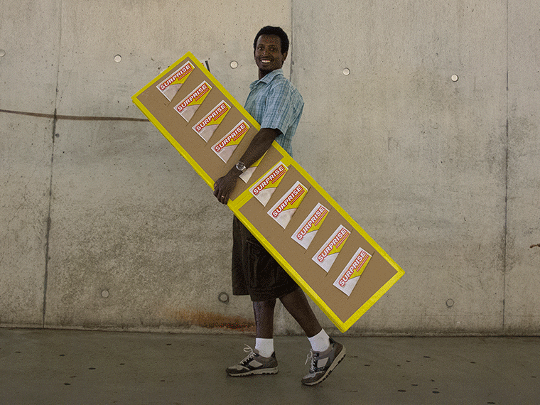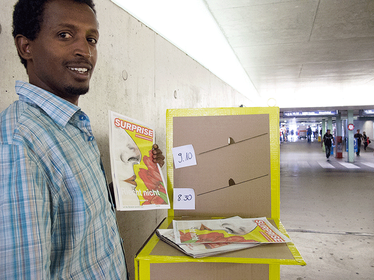 Ghide aus Eritrea ist 33 Jahre alt und verkauft seit 5 Jahren wöchentlich das Strassenmagazin Surprise. Pro verkauftes Magazin verdient er CHF 2.70, wobei der tägliche Verdienst stark variiert und nicht zuletzt von der Gunst der Passanten abhängt. Ich wollte Menschen wie Ghide, die keinen oder nur eingeschränkten Zugang zum Arbeitsmarkt haben, in ihren Bemühungen unterstützen. Somit entstand die Idee eines mobilen Kartonstands, der Dank des Rohmaterials tiefe Herstellungskosten aufweist und leicht zu transportieren ist. Der Stand ist im Nu einsatzbereit und der Verkäufer hat die Möglichkeit, seinen Verkaufsumsatz zu visualisieren, um auf das geringe Einkommen aufmerksam zu machen. Der integrierte Verkaufstisch kann einen Begegnungsort schaffen, welcher zu interessanten Diskussionen mit dem Verkäufer einlädt.